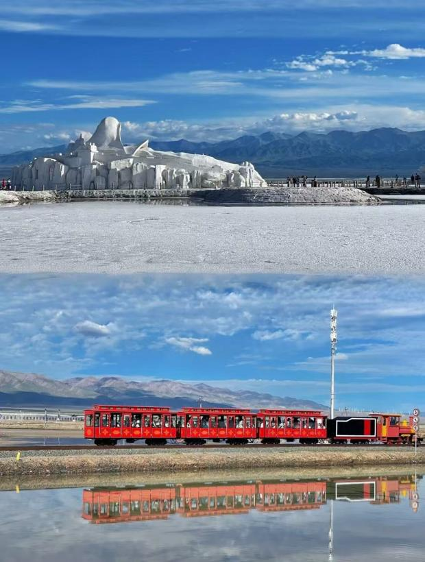 湛蓝天空与澄澈湖水相互交融,让人有一种置身于水中的错觉。走在上面,就像是踏入了一片虚无的天地,不知是天落在湖里,还是湖与天相拥。盐湖轨道,就像是一条时间通道,连接着那个神秘的世界。南北两条轨道,北面是游客进出湖心的期待,南面是神秘莫测的茶卡。坐在小火车上慢慢前进,蓝天白云,白色盐湖,以及远处连绵起伏的群山,组成了一副壮丽的画面,这辆小列车承载着我们进入这幅画,仿佛置身于《千与千寻》的梦幻场景里,驶向那未知而美好的远方。